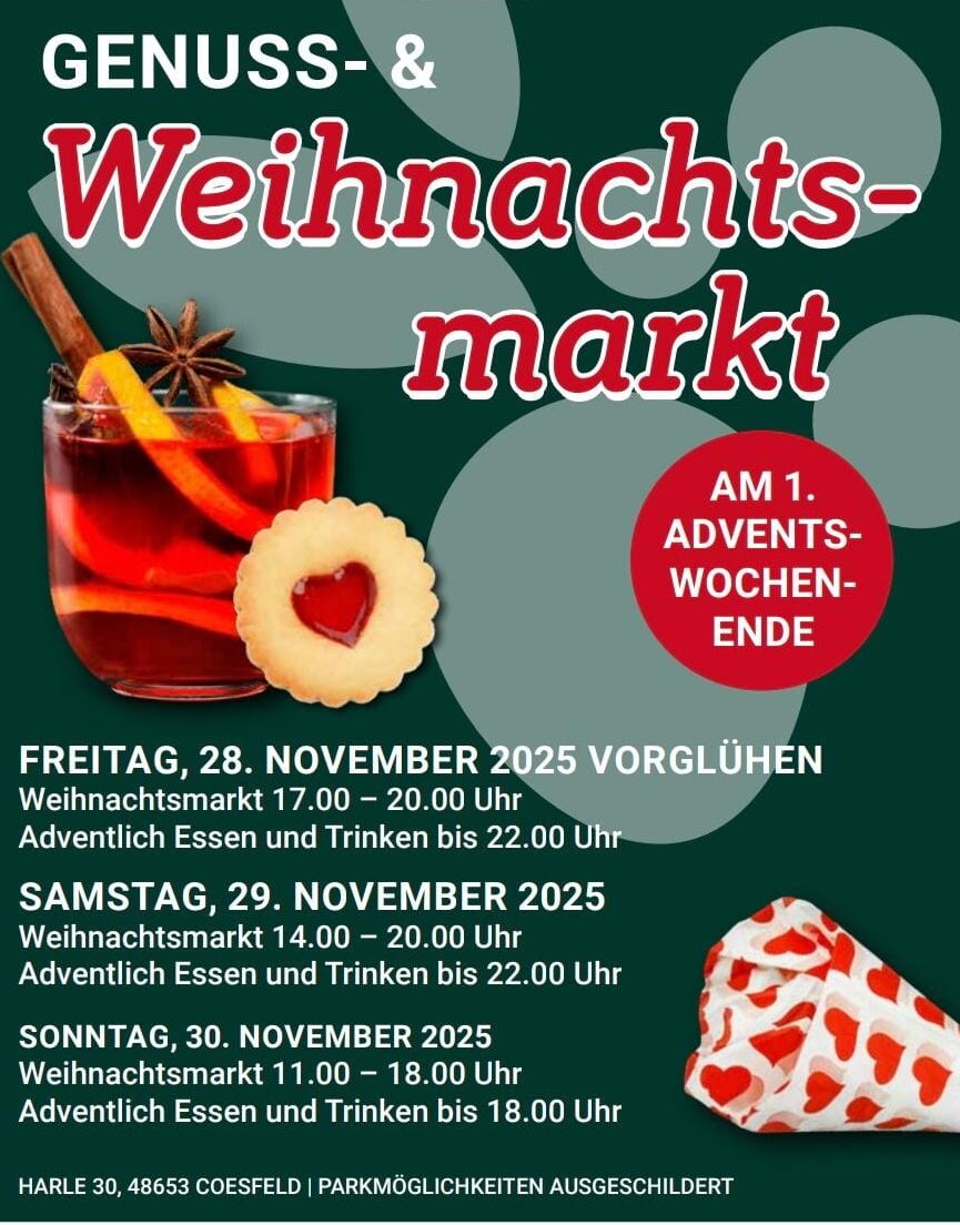 Wenn der Duft von gebrannten Haselnüssen, frisch gebackenen Waffeln, hausgemachten Kuchen und würzigem Glühwein über den Hof zieht, dann ist es wieder soweit – unser Weihnachtsmarkt findet statt. Auf dem Weihnachtsmarkt treffen sich Freunde und Familien bei stimmungsvoller Musik und funkelnden Lichtern. Hier können Sie die Adventzeit einläuten und auch die ersten Geschenke für Weihnachten bei unseren Austellerin*innen aussuchen. Kommen Sie vorbei und lassen Sie sich verzaubern!