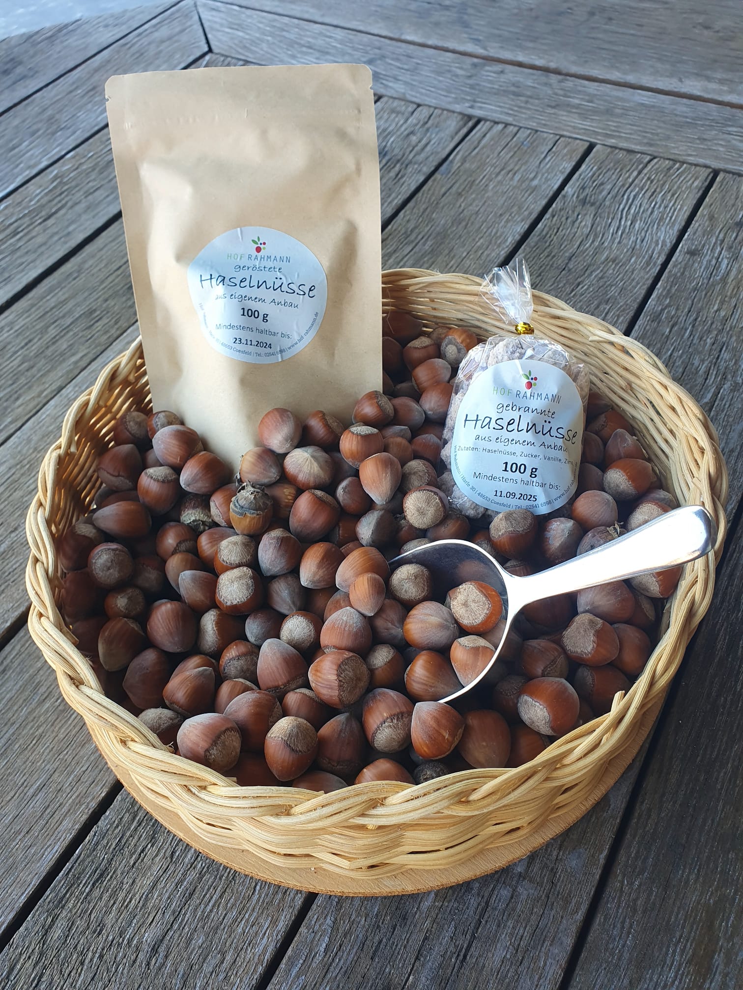 Im Herbst & Winter gehören Nüsse einfach dazu. Bei einem befreundeten Kollegen haben zum ersten Mal selbstangebaute Haselnüsse probiert und die Kultur angeschaut. Wir waren sofort begeistert, deshalb haben wir im Frühjahr 2021 die ersten Haselnuss-Sträucher gepflanzt. Jedes Jahr wird die Ernte größer und wir freuen uns schon darauf ein weiteres eigenes Produkt anbieten zu können. Sie bekommen die Haselnüsse aber auch nicht nur klassisch zum selber knacken, sondern auch geröstet und gebrannt. Den Bruch verarbeiten wir in unseren Nussecken, Plätzchen und Kuchen. Schon bald bieten wir weiteres Produkt an. Seien Sie gespannt…